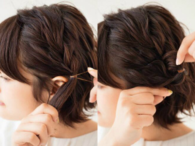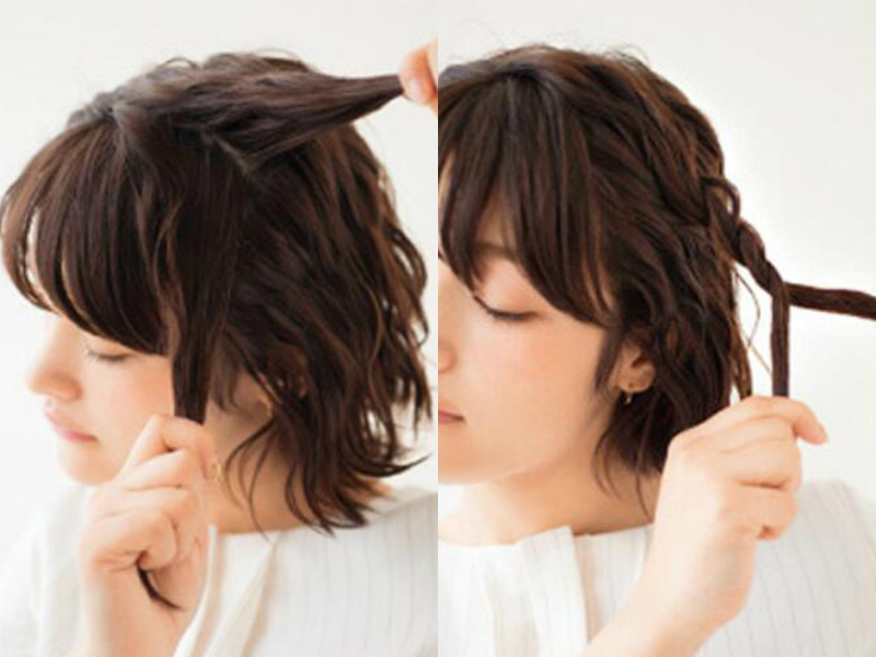 按照图示,在你头发的同样位置先将一部分发束分成两等分,然后将两束头发交叉缠绕在一起,注意不要缠得太紧。
