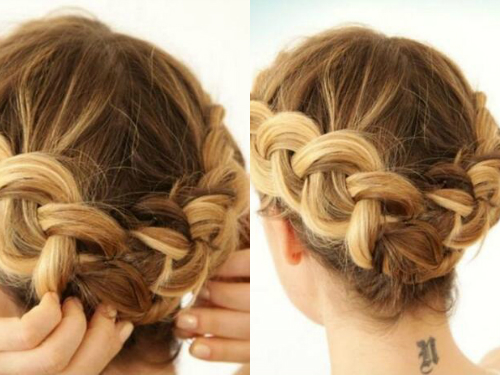 之后将两条发辫放下来,让它们交叠盘在一起,使用发夹固定好,然后将小发髻藏在盘发里,调整一下盘发即可。