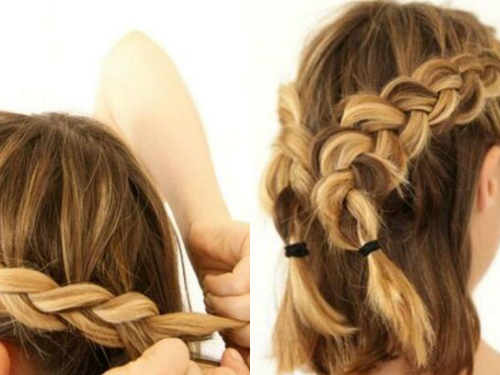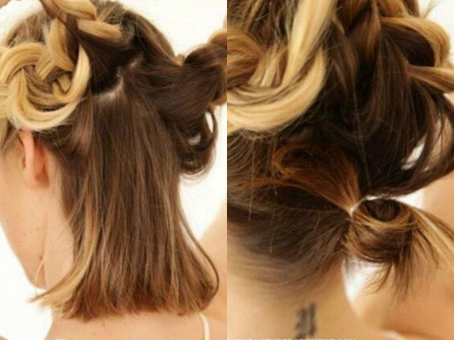将两条辫子拉起,固定在发顶,然后将发尾的头发打折扎起,变成一个小发髻。