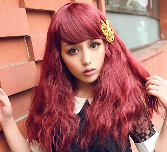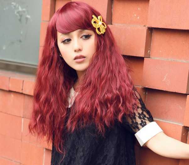 玉米烫卷发发型图片一:酒红斜刘海玉米烫卷发