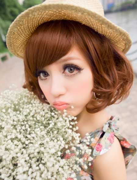 充满复古味道的短烫发发型,斜开的刘海,嘟起来的小嘴,超卖萌可爱的,头上戴着的遮阳草帽,甜美度提升,两颊蓬松的卷发丝,精致小脸打造。