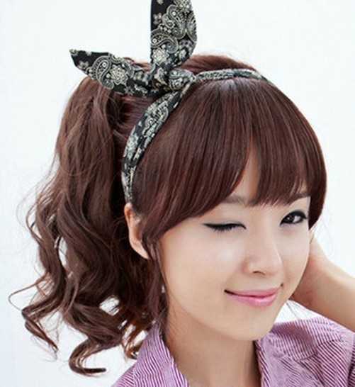 S型弧度的蓬松的卷发,扎起马尾头后,再搭配一款时髦的蝴蝶结发带,将本身单一的风格瞬间变得俏皮可爱起来了,齐刘海的设计,还能甜美又减龄,2013冬季呈现出一个超活力的小女生感觉。