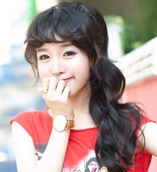 将长长的卷发在侧面扎上一个高高的马尾,露出光洁的额头,更是脸型拉长的效果,侧扎马尾带来的俏丽感让这个女生呈现出清新的一面,还是挺适合2013冬季的气息里哦!