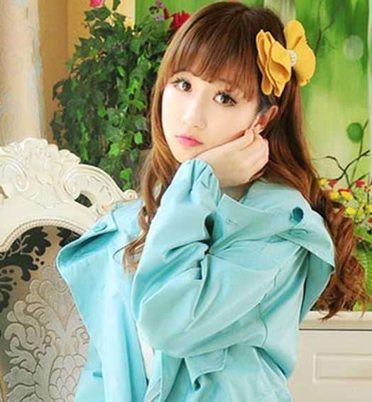 一个薄薄的齐刘海顿时变得甜美可爱起来,再加上一头浅棕色的洋娃娃卷发,更是青春俏皮,配上黄色的蝴蝶结,完全透露出一个韩国温婉的小女生感觉。