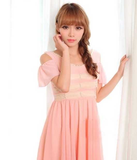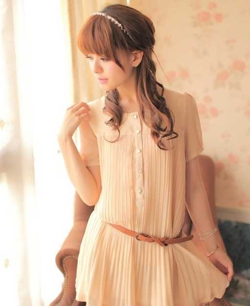 中长的卷发发型,来个蓬松的公主头半扎发设计,更加显示娃娃脸的纯净和典雅的味道,厚感的齐刘海搭配精致发箍,小清新的淑女气质范!