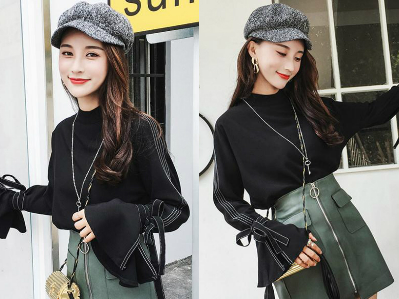经过编织烫卷的长发一侧垂在肩前,一侧披在身后,使妹子看起来温婉大方,无刘海的设计露出一张洁净的脸蛋,一侧头发被夹至耳后,侧面看过去可以清晰的看到女生优美的脸颊线条,搭配一顶花灰色的八角帽很是fashion。
