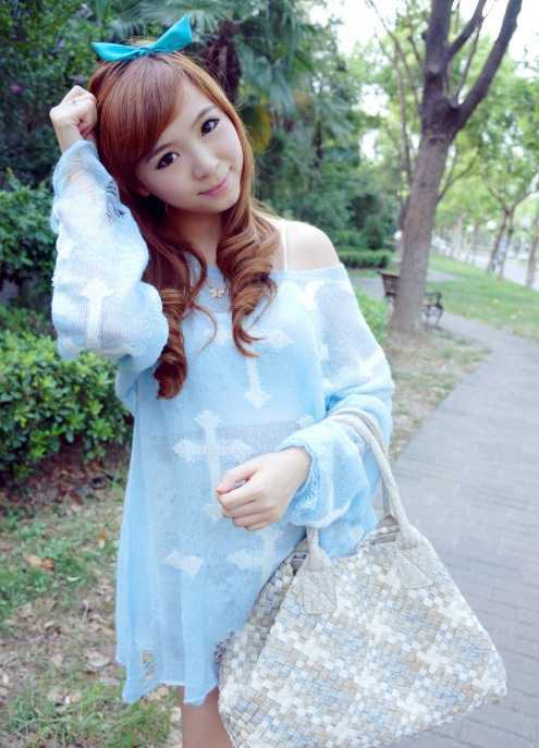 斜刘海,棕黄的卷发,头顶青色的发饰,很甜美哦,而且斜刘海遮住了部分额头,脸就没那么长咯,甜美安静的一款长脸发型。
