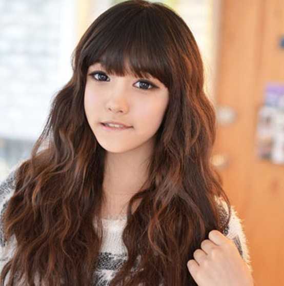 显得少许蓬松的长卷发型,碎发的齐刘海瞬间起到了修颜减龄效果,对于鹅蛋脸的中学生来说显得十分适合,深棕色的染发下,甜美中时尚也倍增哦!