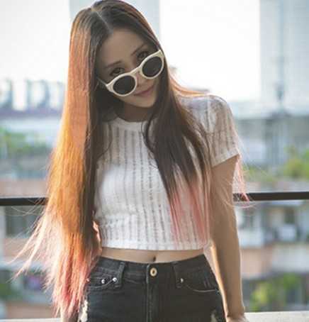 超长的飘逸直发,柔顺的发丝披散在肩上,发尾处挑染的酒红色,更添个性,有点显乖乖女形象,还球场十足,当然,瘦脸的效果也是超棒的,大脸妹子适合!