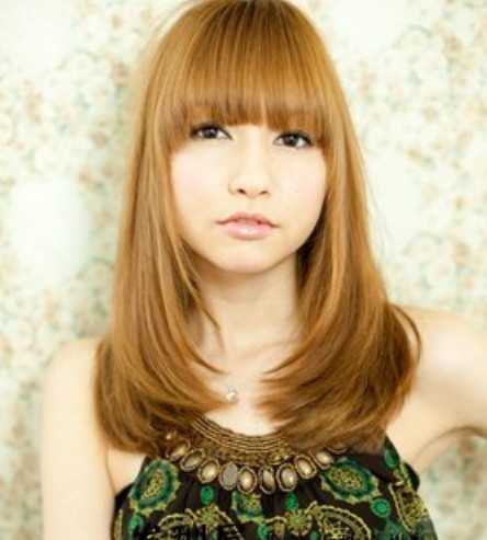 发型点评:这款今年大热的齐刘海内扣中长发,抢眼的金黄染发颜色,最显肤色了,刚到眼睛的齐刘海,内扣的发尾,这样看上去椭圆脸蛋更显精致小巧,减龄又瘦脸的发型。