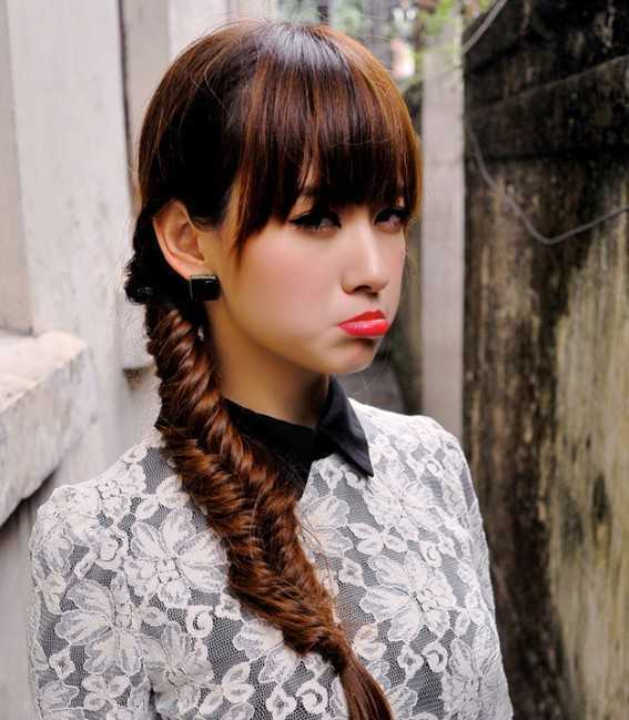 这样看来的国字脸并不是想象中的不完美了,长发的基础上来个侧扎鱼骨辫发,气质又清新甜美,长直齐刘海设计,再来个嘟嘴动作,俏皮又是十分的可爱呀!