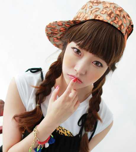 带点朋克风范的一款女生造型,齐整的长刘海遮住额头,小脸型变得娇俏起来,田园风的麻花辫减龄可爱,歪戴棒球帽,生气的小模样,更显个性帅气。