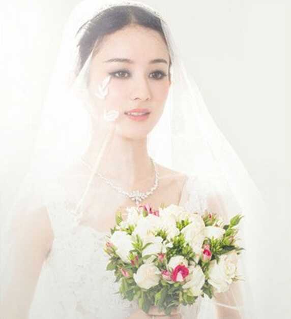 发型点评:把完美的大圆脸展现出来吧,中分发型全部梳在脑后,精致的妆容,戴上唯美的头纱盖住头部,赵丽颖圆脸婚纱照发型演绎出新娘的浪漫气息!