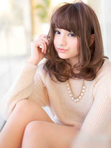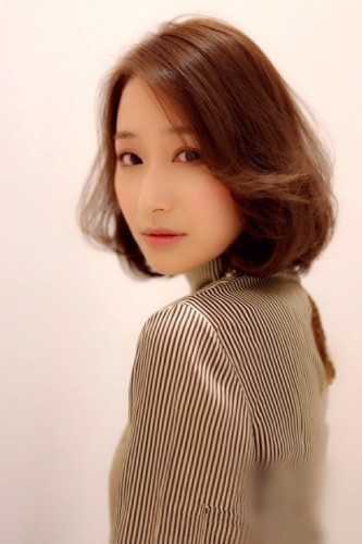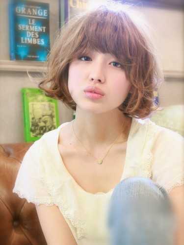 一款非常日系的短卷发发型,厚重的齐刘海内卷出蓬松卷曲的效果,尽显小清新,搭在两颊的发尾作内扣处理,十分瘦脸,浅棕色的染发颜色不仅潮范十足,更将肤色衬托得白皙如雪。