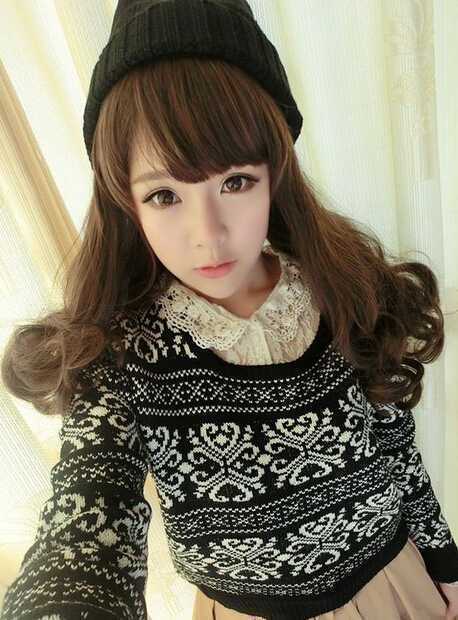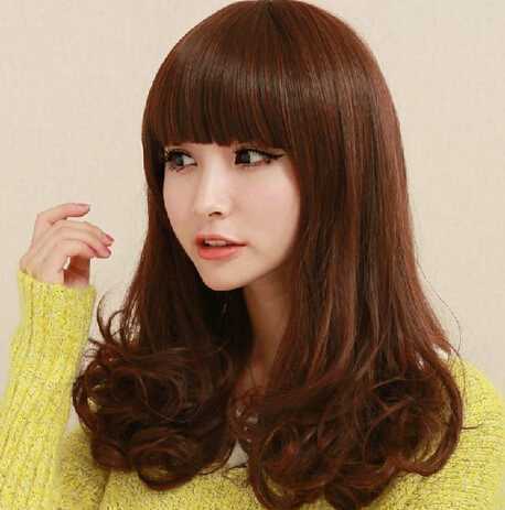 中长梨花头发型图片4、厚重的齐刘海,瞬间增添了可爱气息,这是很多小女生喜欢的刘海款式,下面是中长的梨花卷,搭配起来既甜美又不失乖巧哦!