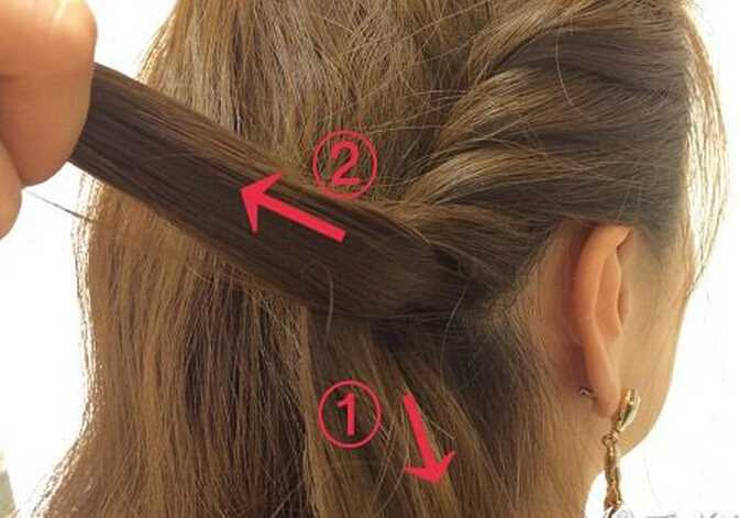 1、先简单梳理长卷发,再从取出右侧的头发分成两部分,扭转成发辫并不断并入下方的头发,如图。