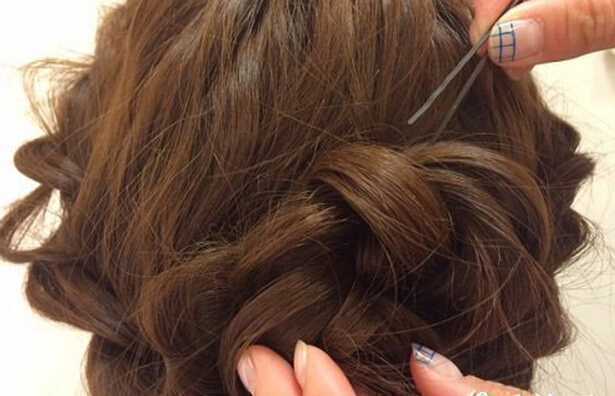 4、然后把两束发辫盘出发髻造型并用发夹固定。