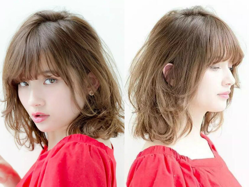 浅棕色发色十分衬肤色,使妹子本就白皙的皮肤变得更加细腻,齐刘海经过烫发处理变得蓬松饱满,打造出饱满的额头,齐脖的发尾经过烫发之后卷曲翻翘,顿时充满空气感,使发型看起来很唯美。