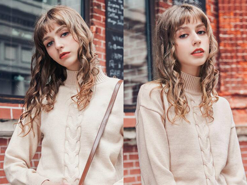妹子一头金棕色的中长发看着便很抢眼,发色时尚而迷人,不过眉的刘海修剪平齐,垂在额前立马突出女生立体的五官,螺旋烫后的发丝充满卷度,垂落在肩前看起弹性十足,不经意间又起到修饰脸型的作用。