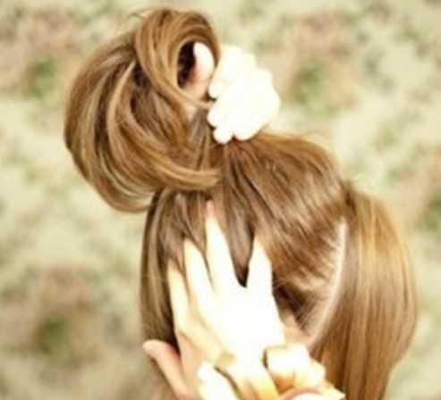 步骤一:先把后面全部的头发用手向上抓起来,记得前面的要流出刘海,如图所示。