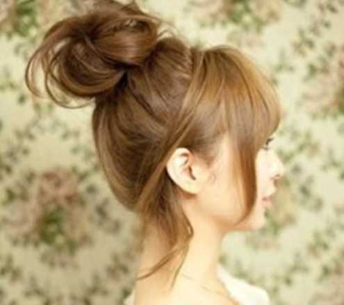 韩式风格的一款短发丸子头扎发,蓬松的丸子头带来不一样的时尚感,前面的碎刘海,看上去很甜美,两颊碎发尾修脸最佳,从侧面看上去也非常唯美哦!