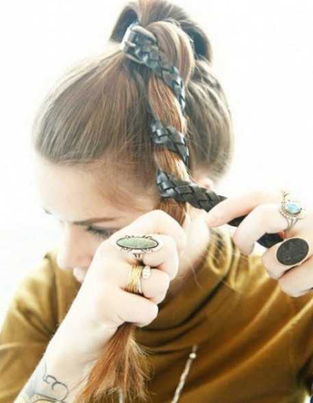 步骤三:准备好一条皮带,固定在马尾的顶部,只要固定好一端就可以。