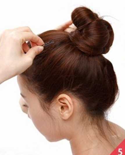步骤五:将发辫绕成花苞头之后用一字夹在发辫的周围进行固定。