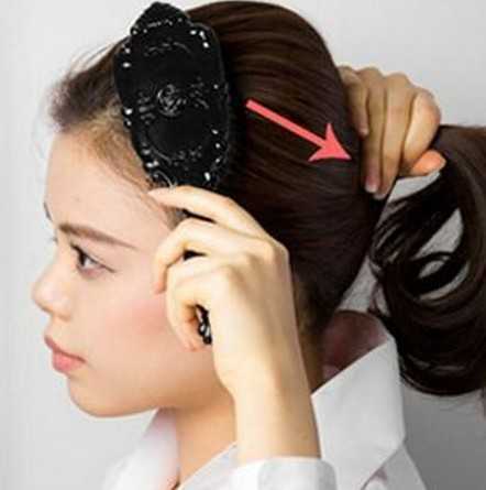 6、然后把发尾固定在马尾部分,再食堂小发卡来固定松散的发丝,这样使发型看起来显得更整洁了。
