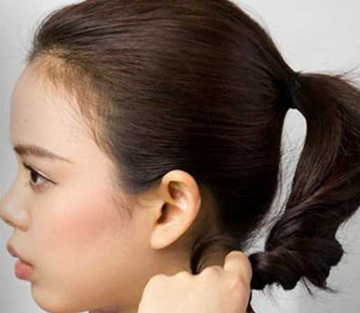4、使用橡皮筋扎好马尾,如图所示,用手把马尾扭转起来。