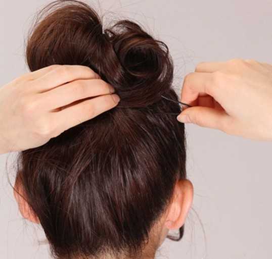 2、然后把马尾旋转打圈缠绕在橡皮筋上,再将发尾隐藏在丸子头中,使用U型卡固定好。