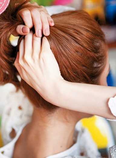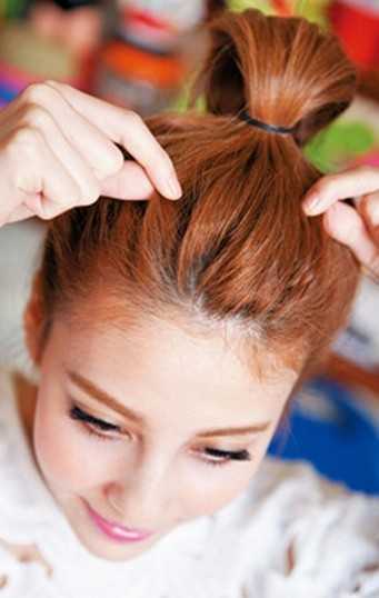 2、再用手轻轻把顶部的头发拉送散些,为下面的发型更添美感。