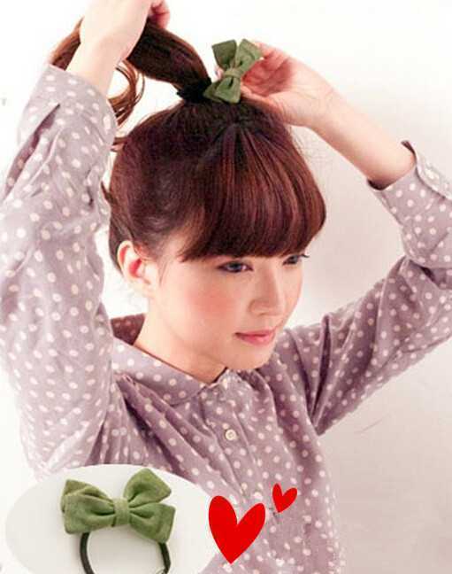 这是款高扎的学生丸子头扎发造型,厚重的刘海完美遮住额头修饰出小脸型,高耸的丸子头高高扎在头顶上,与完美的脖颈曲线结合,十分清新可爱。丸子头上的一只绿色蝴蝶结发饰装饰更显清新。