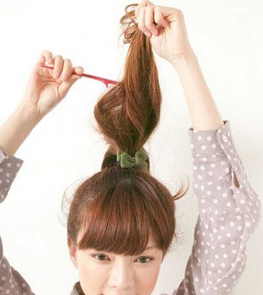 步骤四:高拉扯住扎好发尾,用密齿梳打毛发束。