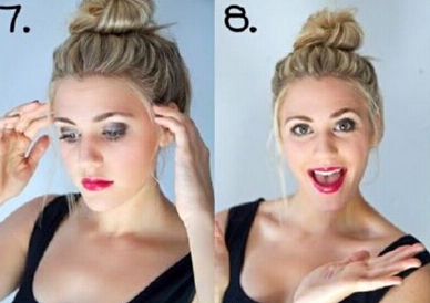 欧美丸子头扎法step07、step08》》》》高耸的丸子头旋转卷成型后,可以将发尾塞入马尾处的橡皮圈里,还要使用一字夹加以固定。最后可以从鬓角处挑出少量发丝作为发型的修饰,但要注意的是在轻扯发丝的时候不能扯松整体造型喔。
