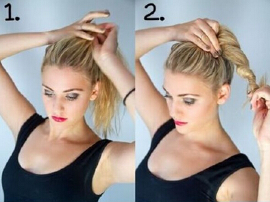 欧美丸子头扎法step03、step04》》》》用橡皮圈固定好马尾之后,将马尾一直旋转拧紧,紧实的程度因人而异,但是要确保不能过于松散。