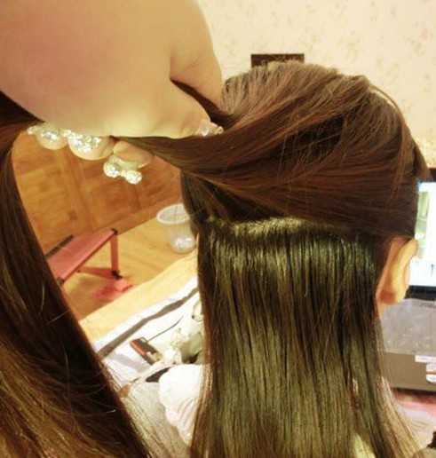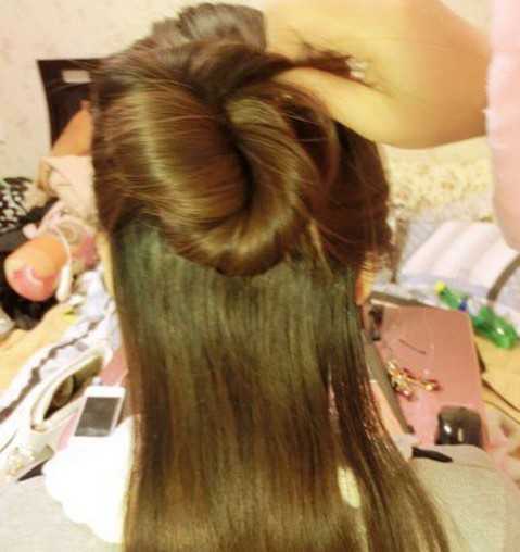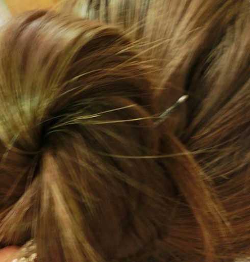 图解五:用U型夹子把弄好的花苞头固定好位置,注意把发尾隐藏好。