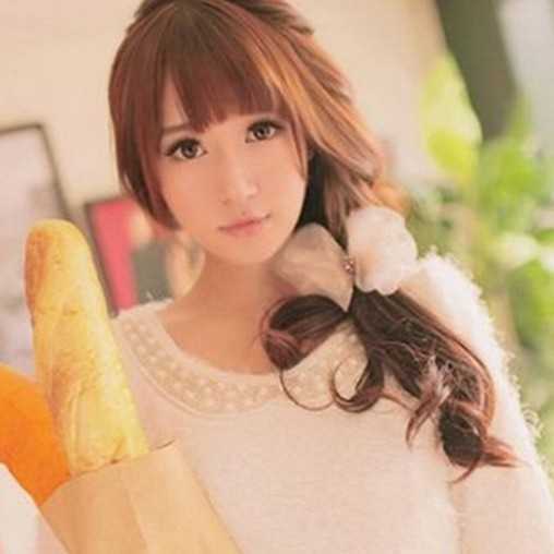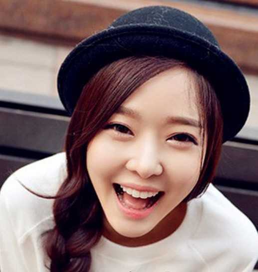 超甜美韩系范的麻花辫扎发发型,养眼又显得时尚的棕红发色,增添了光泽亮丽感,侧扎马尾搭配爵士帽子显得俏皮可爱,大大咧咧的笑容,呈现出一个天真无邪的女生形象。