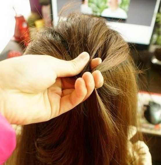 2、编织在脑后中间的位置使用橡皮筋扎好,如图所示。