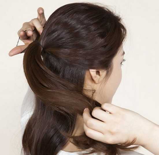 4、接着取出一束头发,缠绕橡皮筋后用发夹固定。