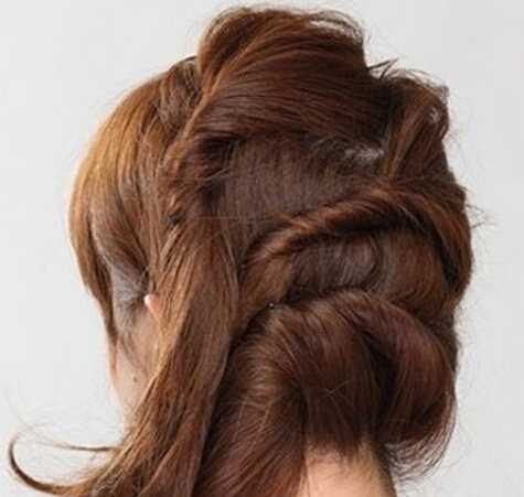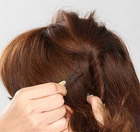 1、先从头顶左侧处挑取一小束头发,再将发束扭转并固定在耳朵上方。