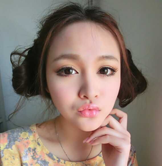 发型点评:这款棕色染发韩式中分梨花头造型,两鬓的头发以中分为分界线扎成两个发髻,露出饱满的额头,内扣的发尾今天脸颊,十分韩式时尚的无刘海扎发哦!