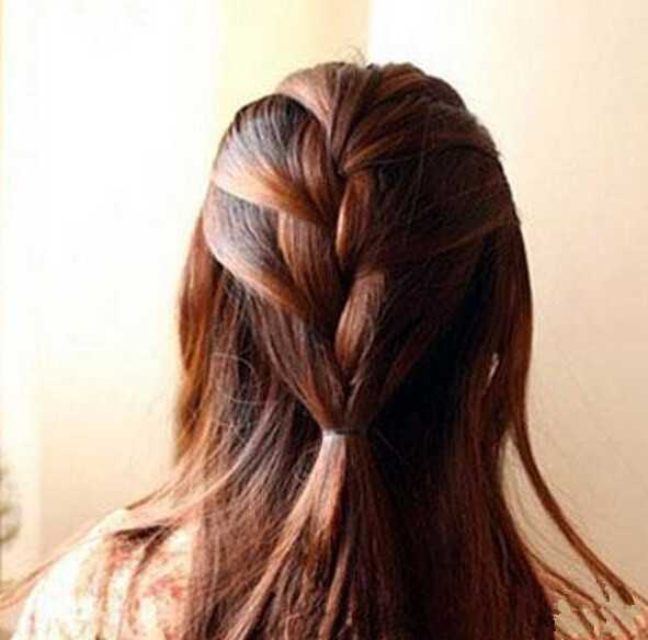 步骤二:用编织蜈蚣辫的扎发方法扎到脖子处位置,之后用皮筋扎好固定。