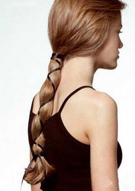 步骤三:然后再把那条黑色绸带的两端来回交叉绑在马尾上,绸带一定要拉近,绑好后,再从马尾尾端打个结实的结;