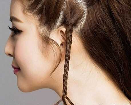 步骤一:首先两边耳朵上方取一小束头发,将其他的头发固定好,再将小发束扎出三股辫的造型,用黑色的橡皮筋固定好即可。