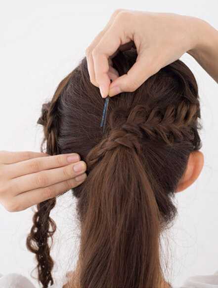 step3、用小发夹把麻花辫固定在脑后的马尾位置,具体如图;