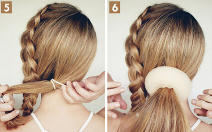 韩式发型扎法03》》》》》将剩余一部分的头发扎起来,注意不用扎得太高,低马尾即可,然后使用事先就准备好的海绵甜甜圈盘发器套进低马尾里。