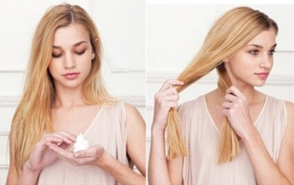 扎发教程step01》》》》》首先,用发妆品为整个秀发造型打底,让秀发更好地塑形,然后将其分成均分两大束。