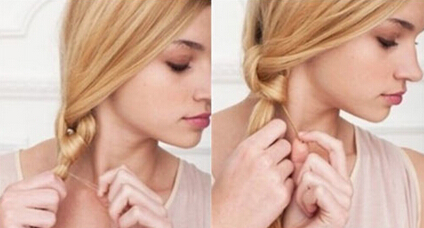 扎发教程step03》》》》》打完两个结后,用橡皮圈将其固定,然后用发丝将橡皮圈遮盖住。