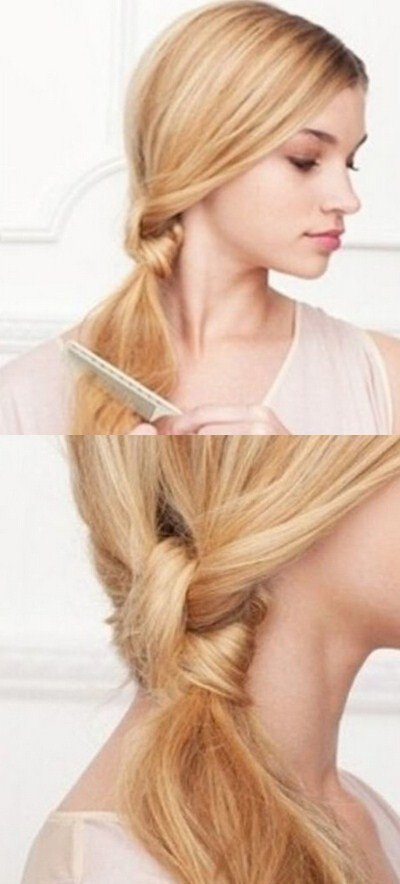 扎发教程step04》》》》》固定好之后,利用密齿梳将剩余的马尾由下往上梳,将长马尾的造型弄得更加蓬松好看。