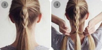 【韩式发型扎法step03】固定好之后,再从剩余的马尾两侧分别挑出两撮发丝,用橡皮圈固定在中间(如图)